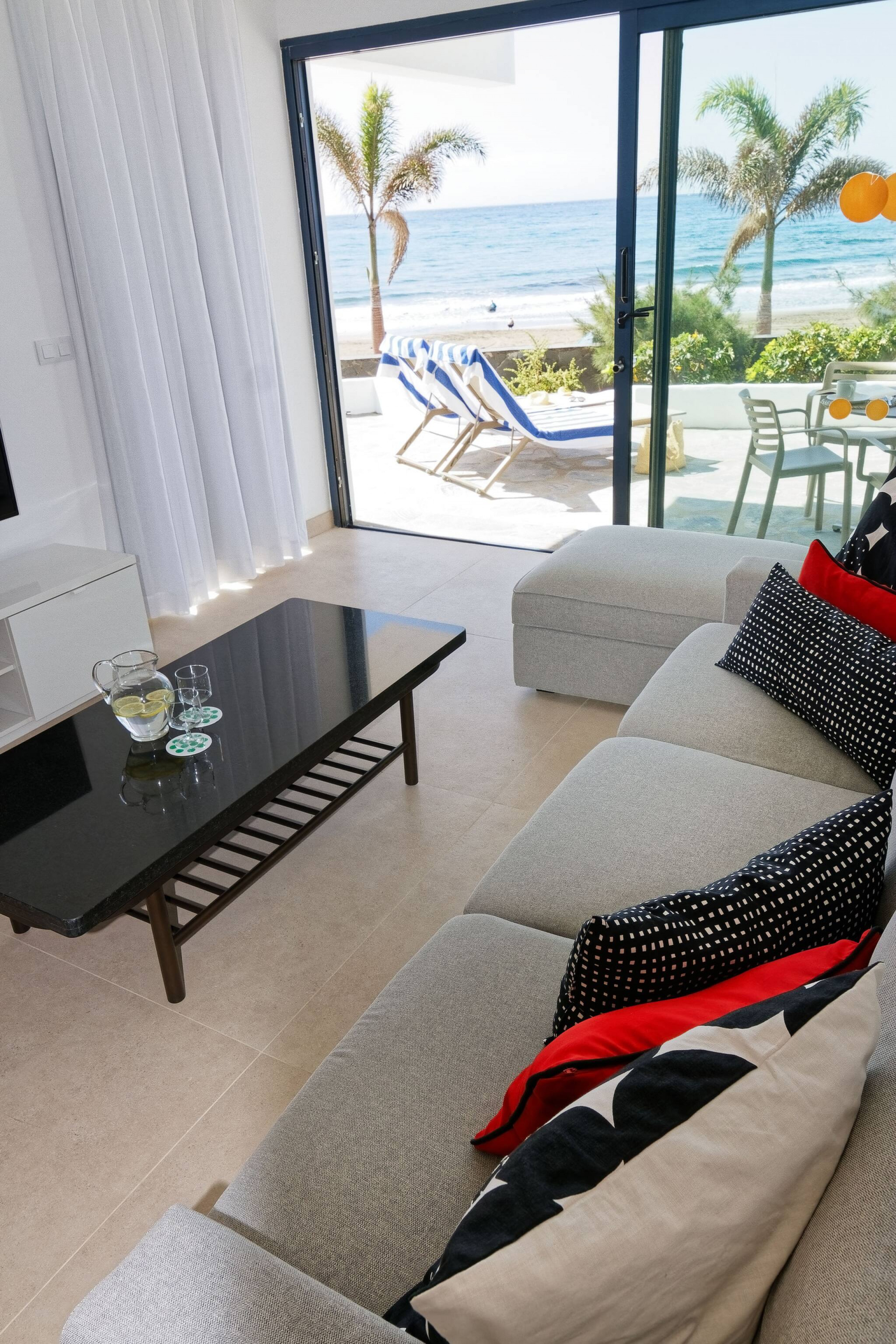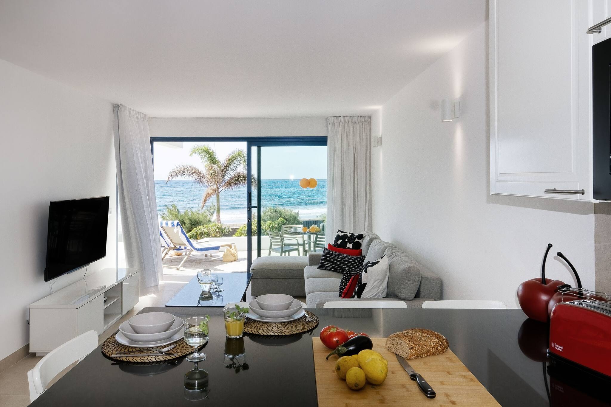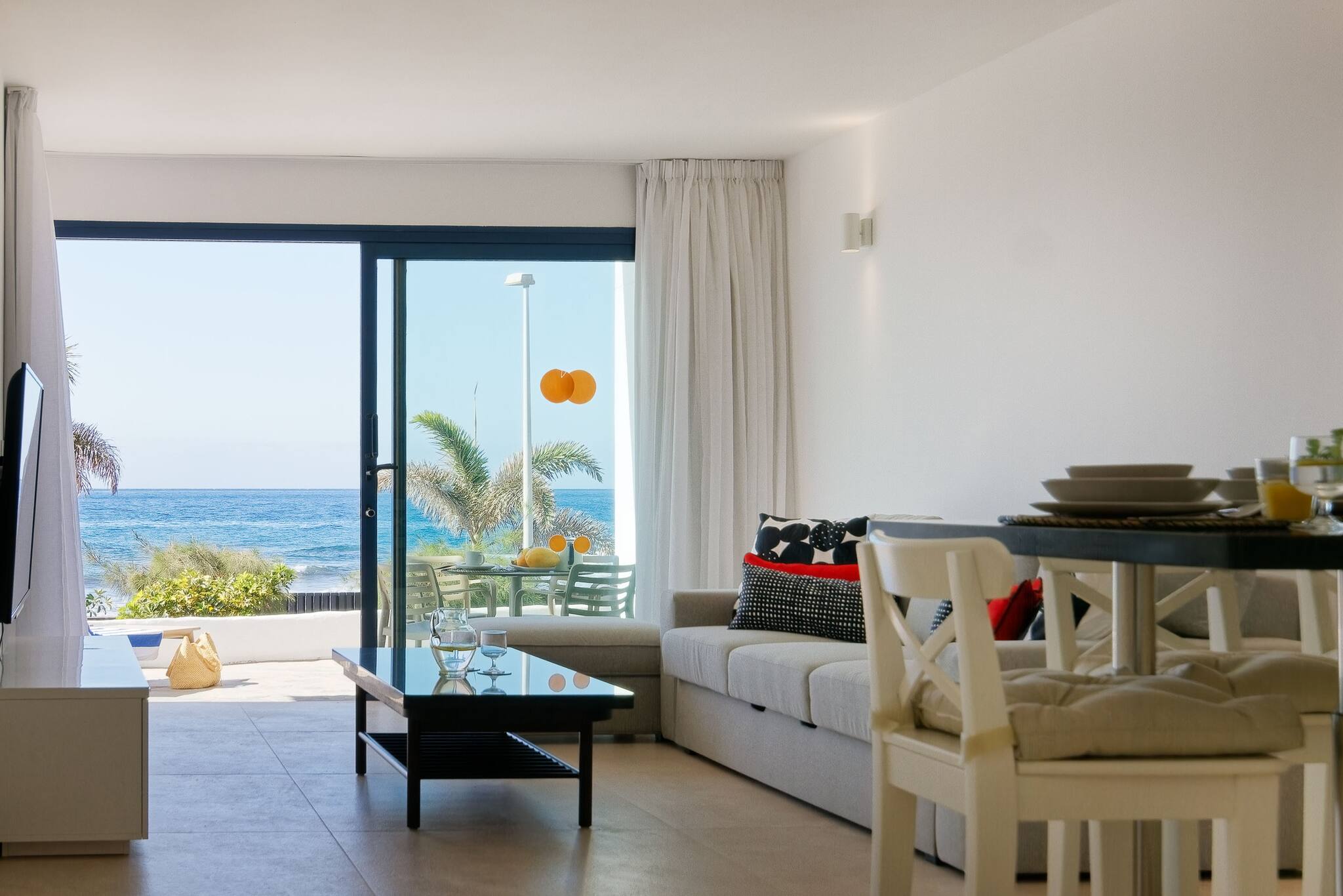 El amplio salón con cocina integrada se abre a una terraza privada con tumbonas, perfecta para tomar el sol y disfrutar del clima. El complejo Amapola cuenta con acceso directo a la playa a través de una puerta trasera que conecta con la avenida marítima.