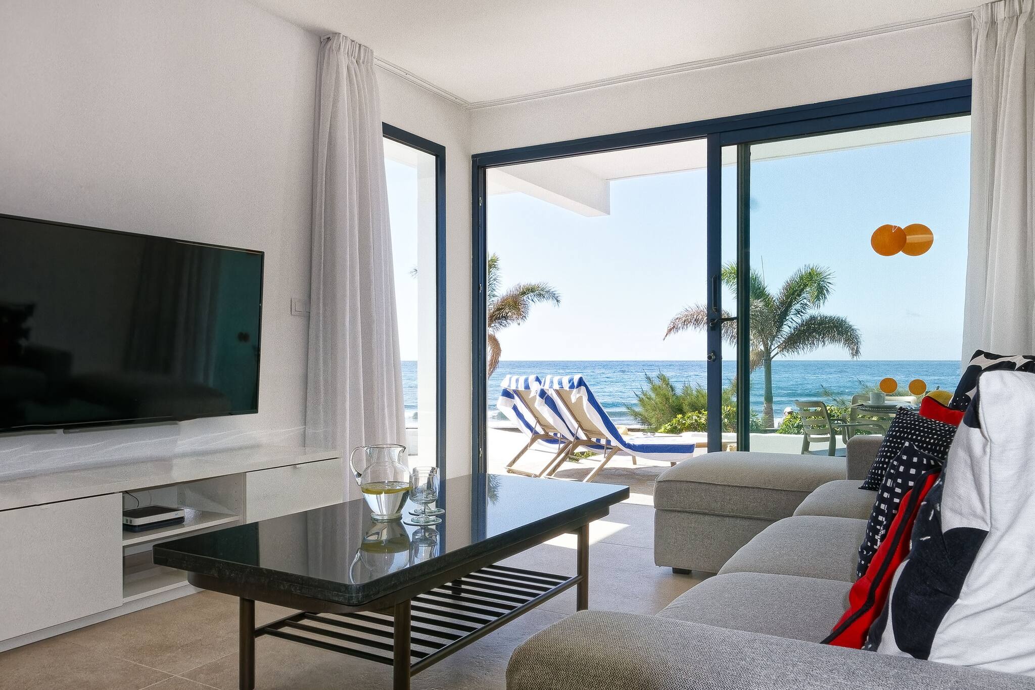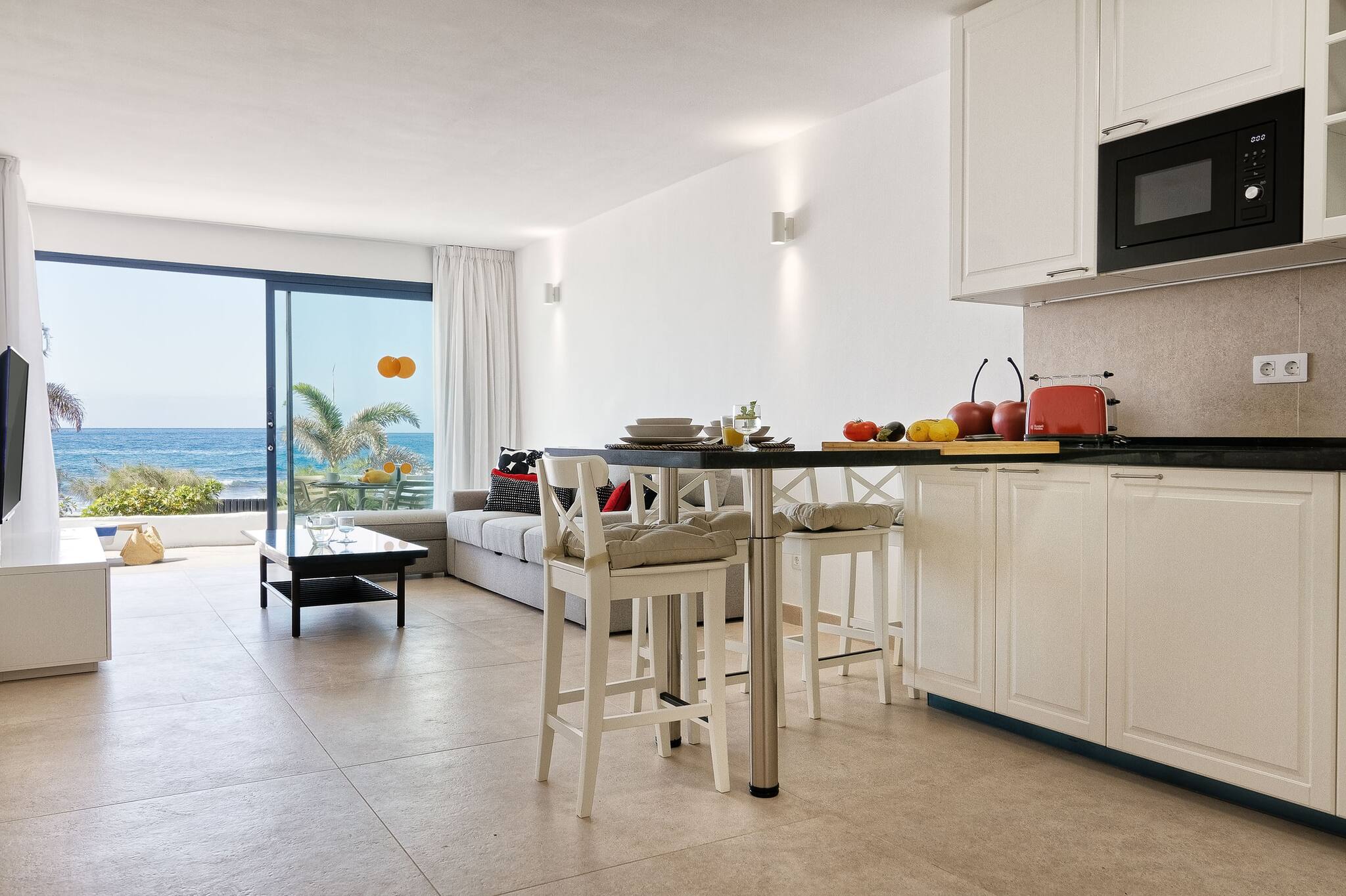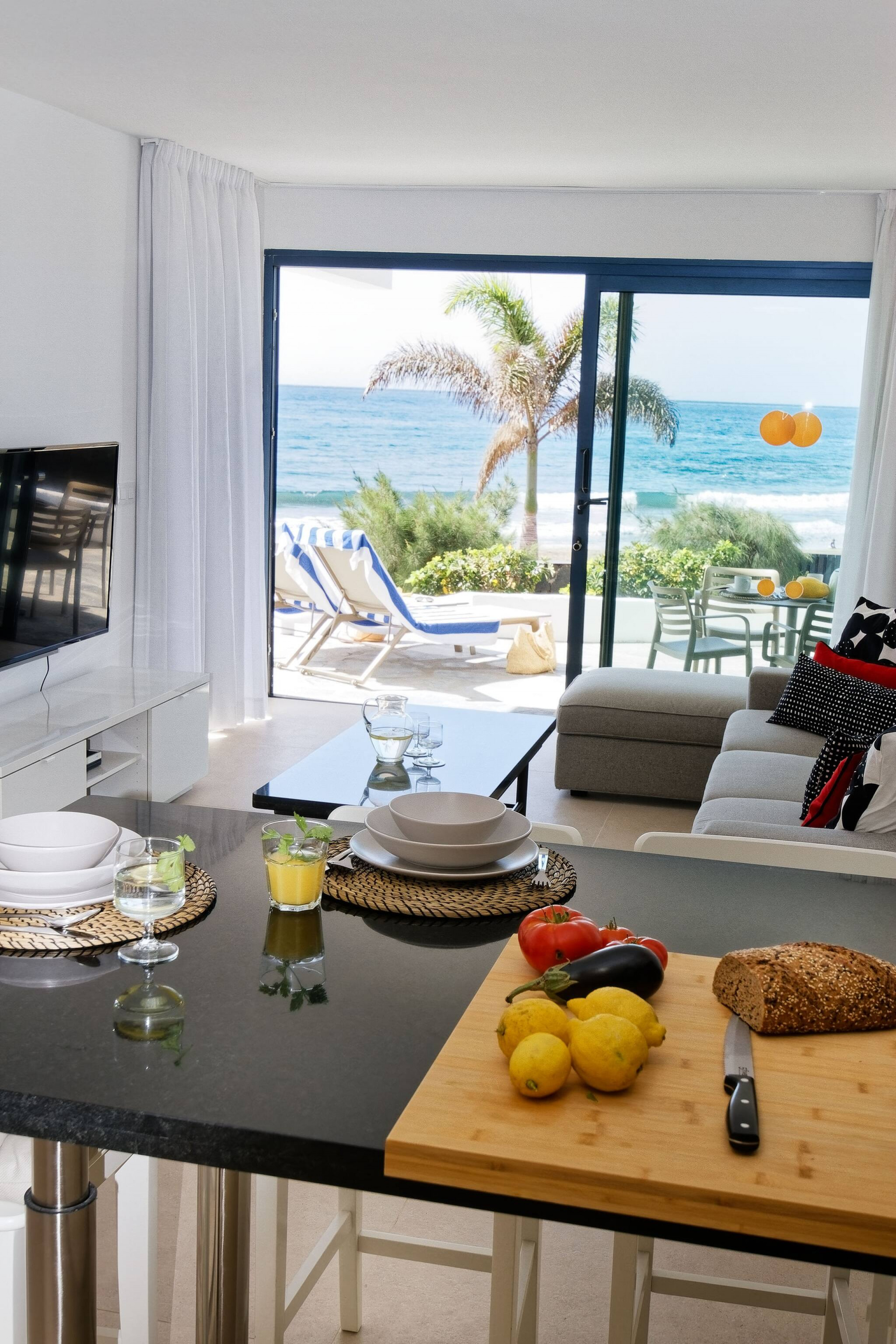 El amplio salón con cocina integrada se abre a una terraza privada con tumbonas, perfecta para tomar el sol y disfrutar del clima. El complejo Amapola cuenta con acceso directo a la playa a través de una puerta trasera que conecta con la avenida marítima.