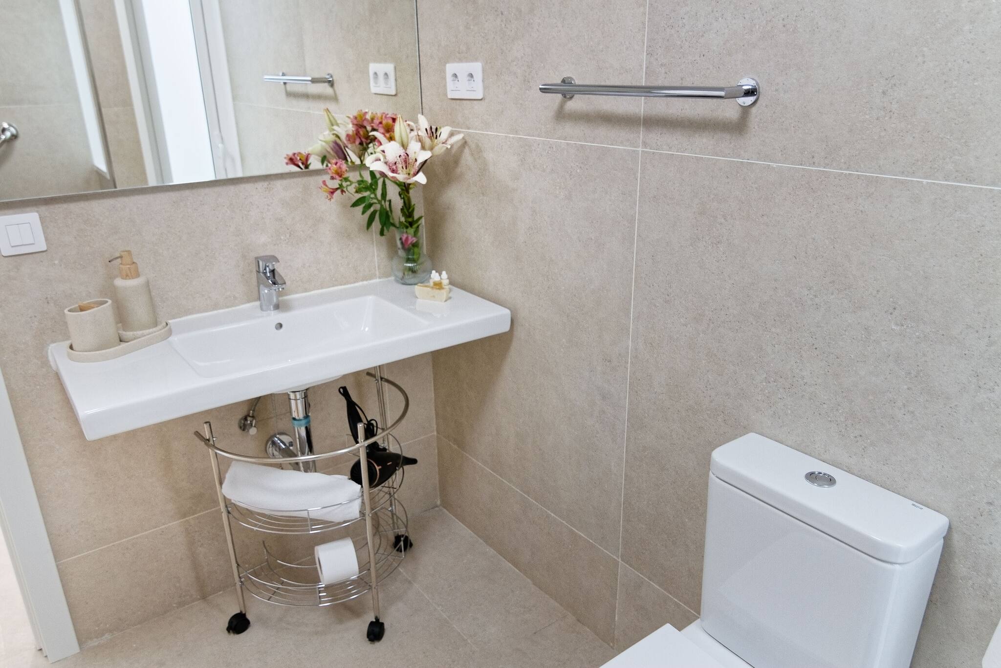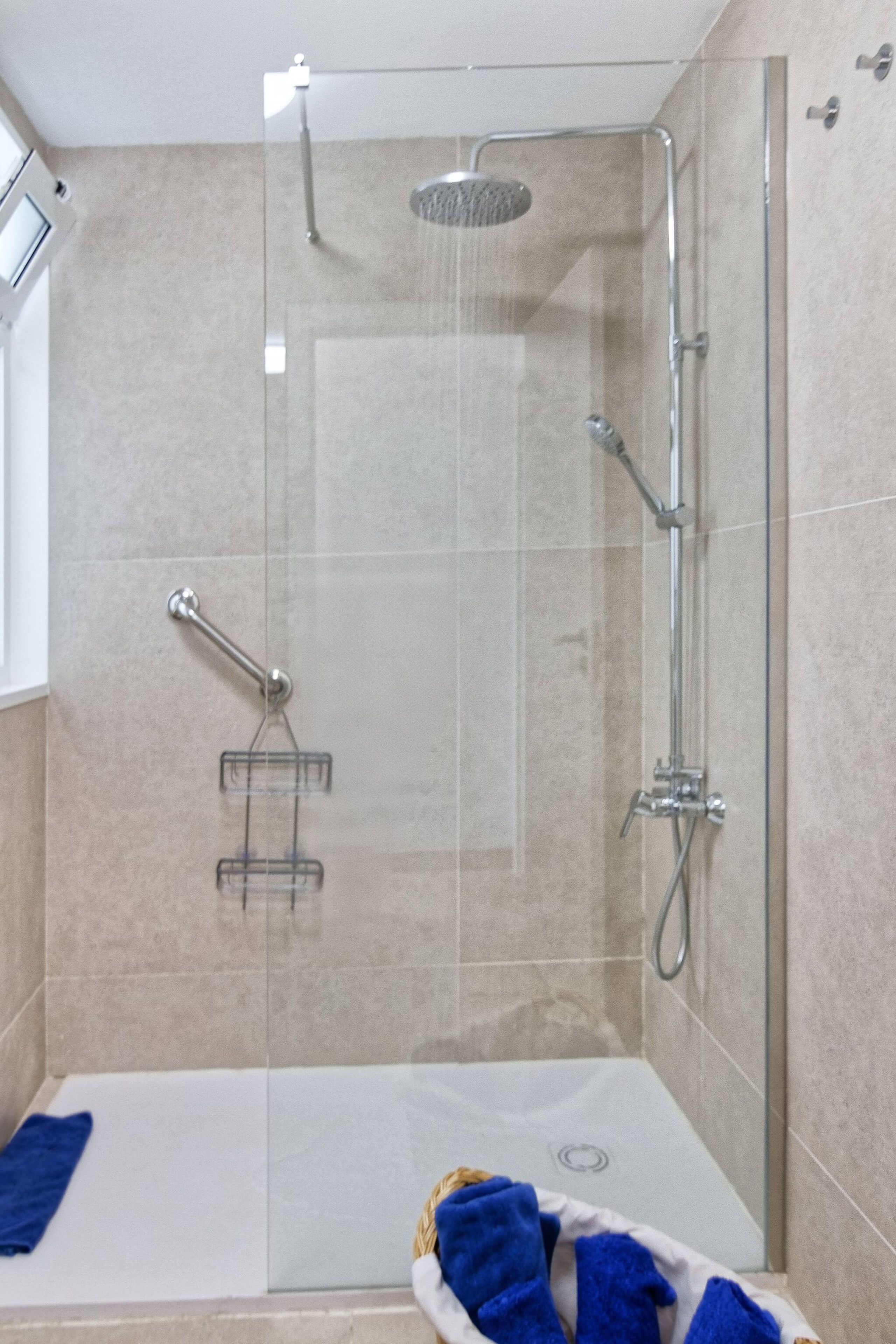 🚿 1 baño con ducha de mampara, encimera de madera y detalles funcionales