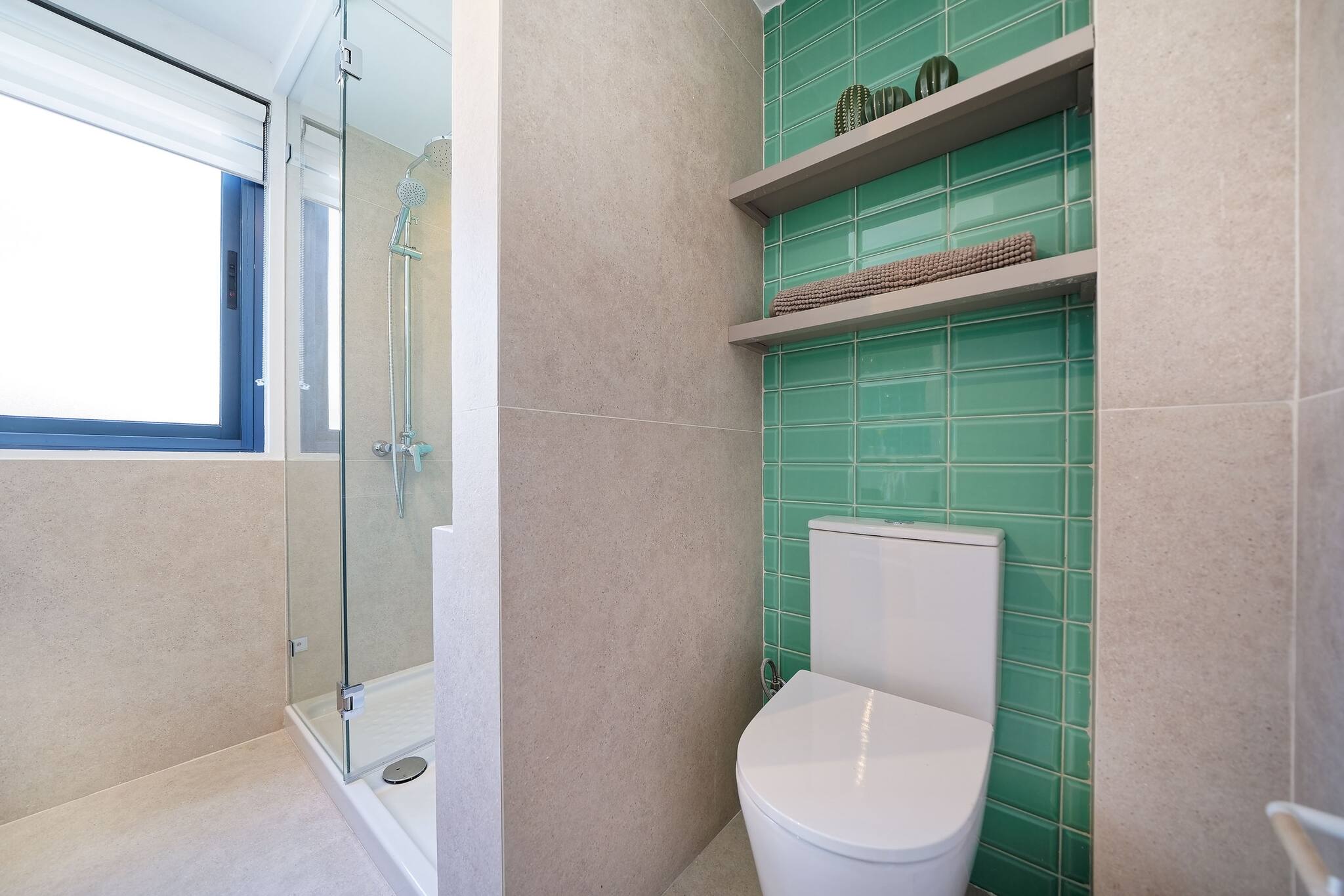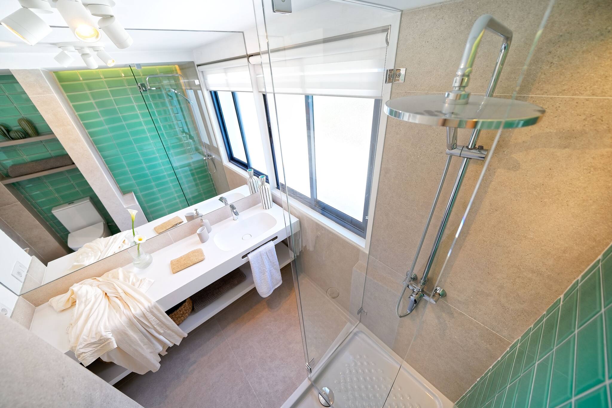 🚿 1 baño con ducha de mampara, encimera de madera y detalles funcionales