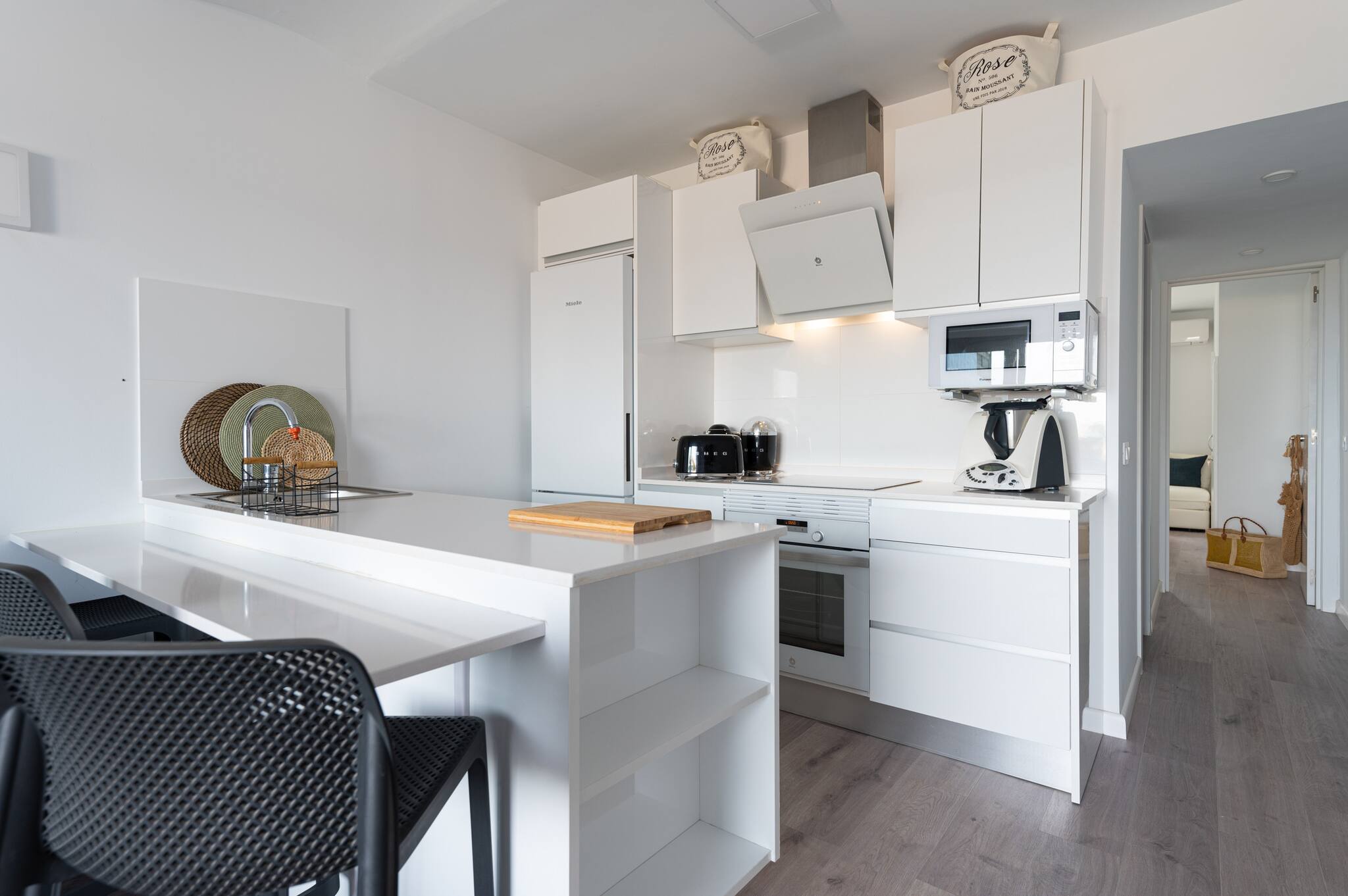🍳 Cocina abierta con barra americana y electrodomésticos Smeg, Thermomix y lavadora