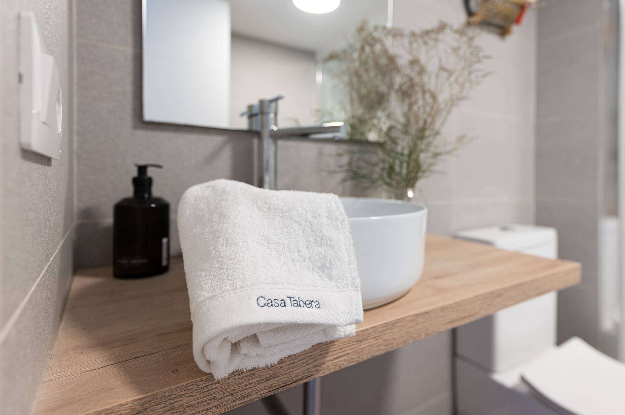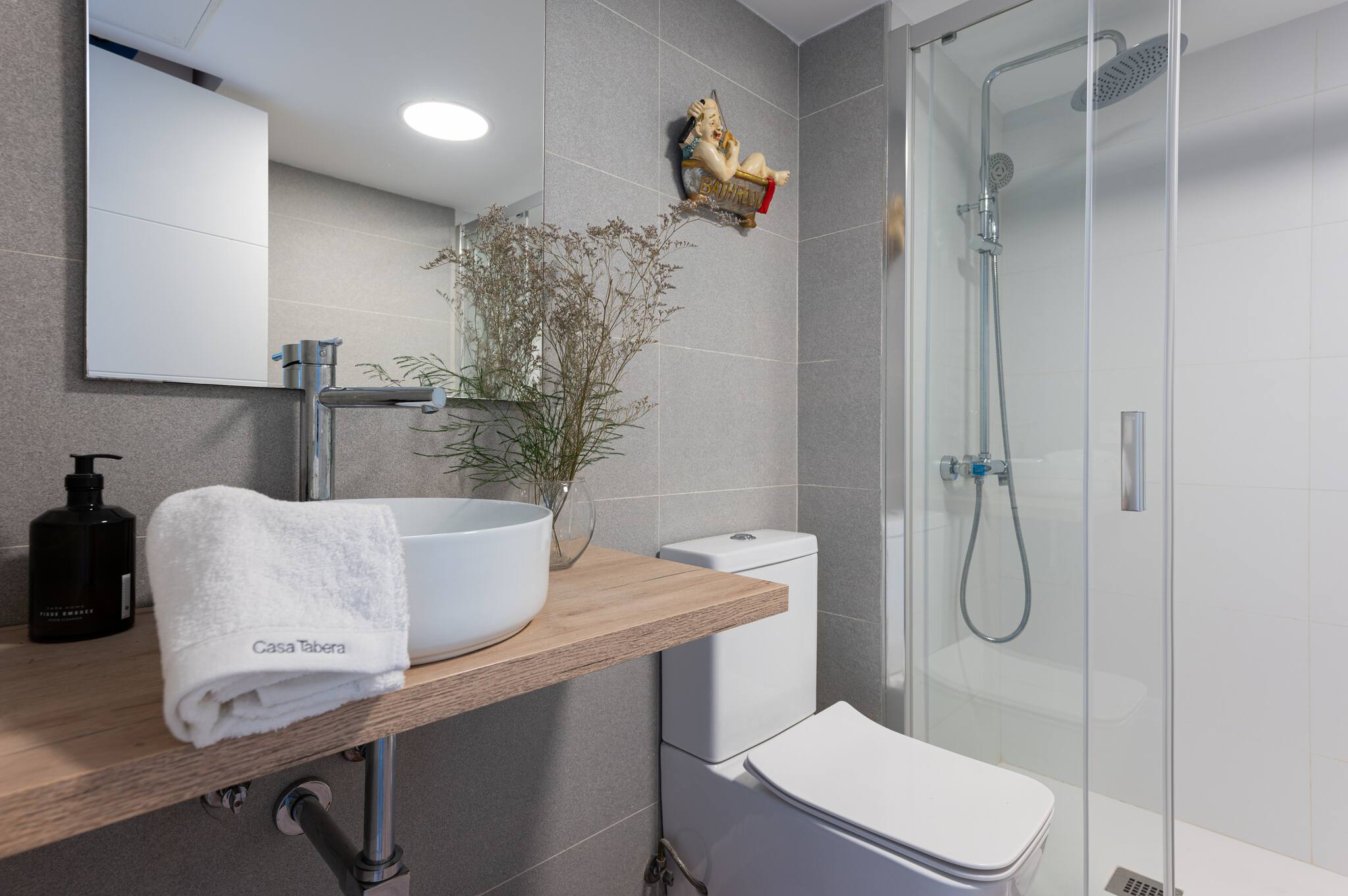🚿 1 baño con ducha de mampara, encimera de madera y detalles funcionales