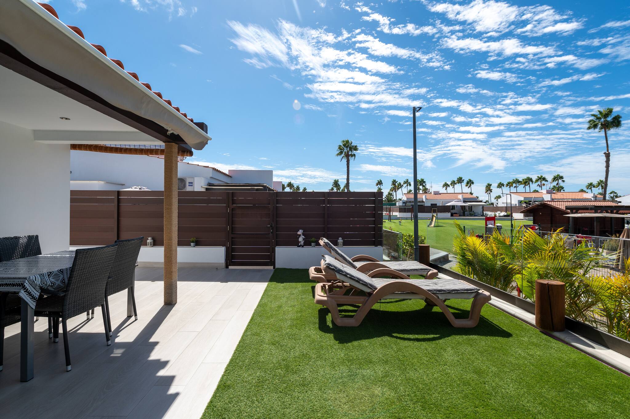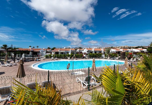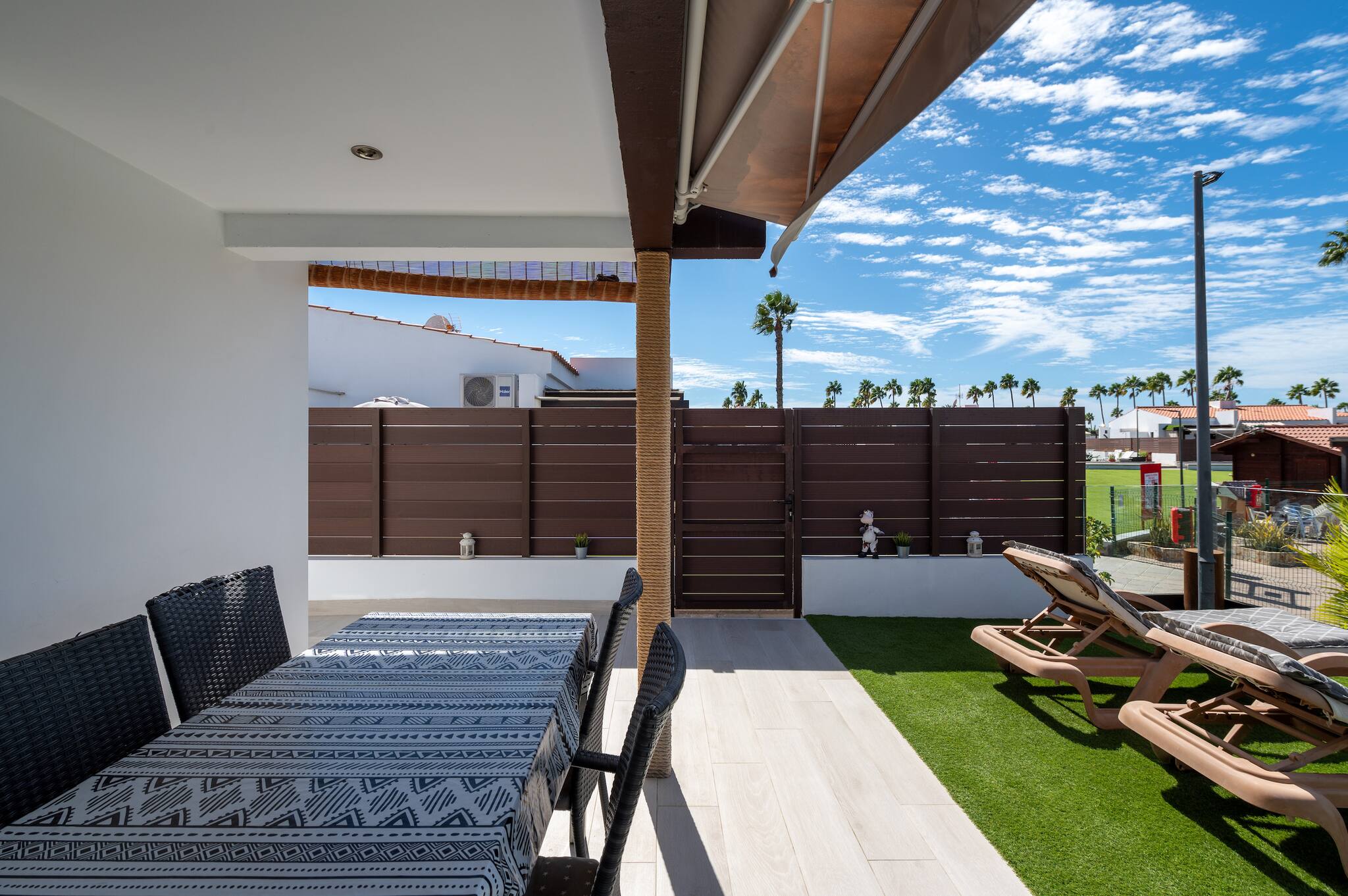 Coqueto bungalow con terraza privada dentro del complejo Colorado Golf, ubicado cerca de la playa de Maspalomas. Con un dormitorio y un sofá cama en el salón para una persona.