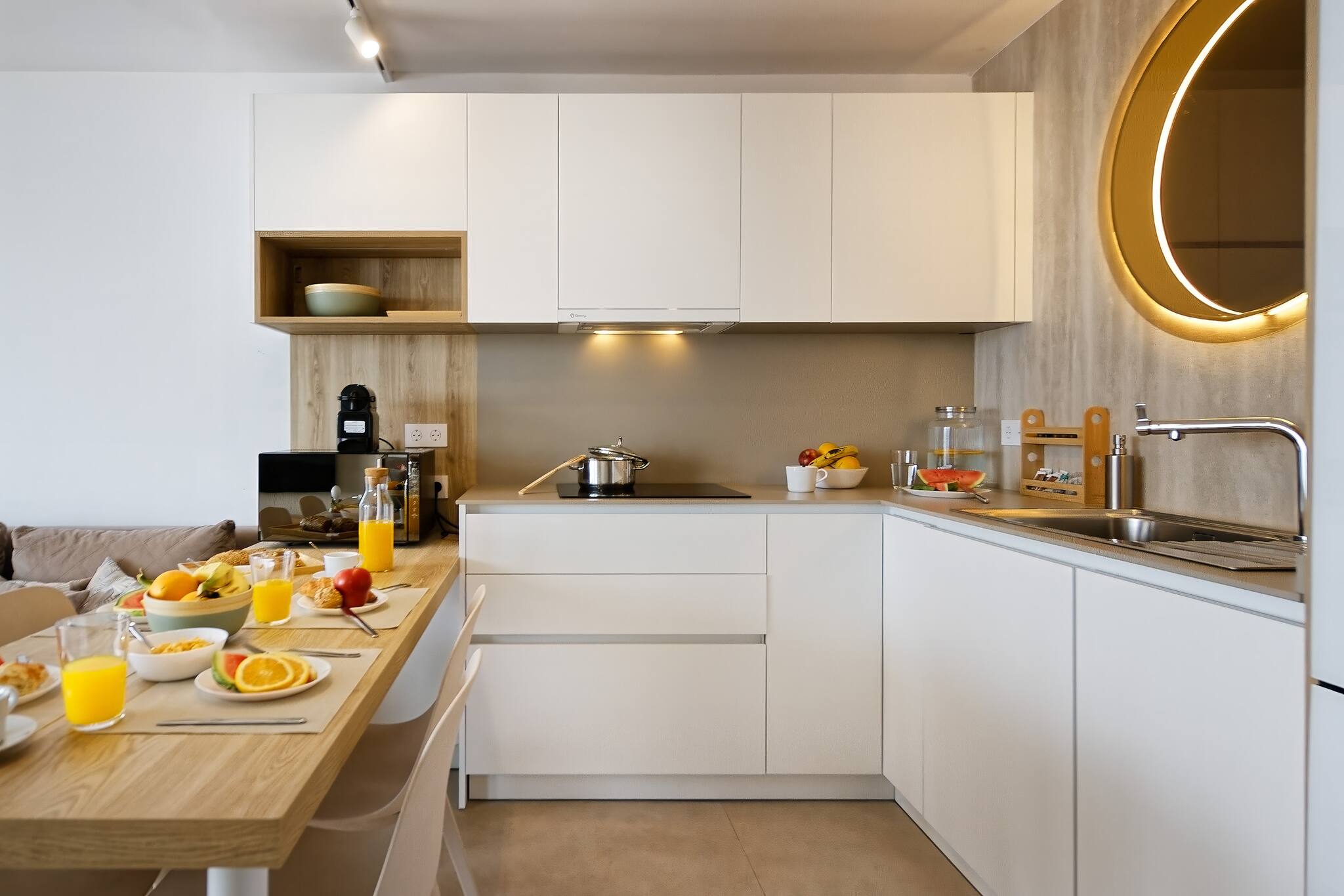 In the hotplate of glass ceramics open plan kitchen, refrigerator, microwave, oven, freezer, dishwasher, dishes/cutlery, kitchen utensils, coffee machine, toaster, kettle and hob are provided.