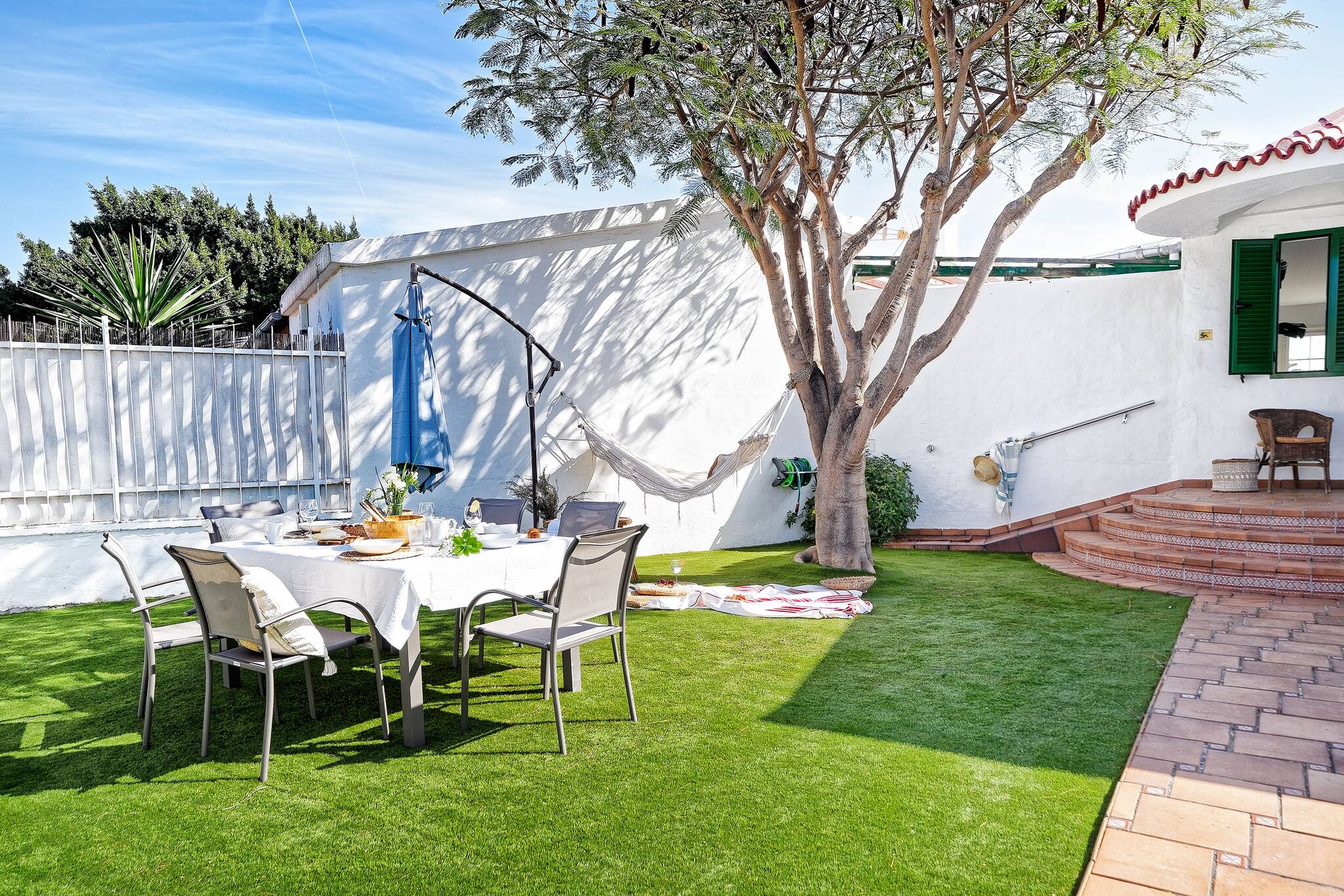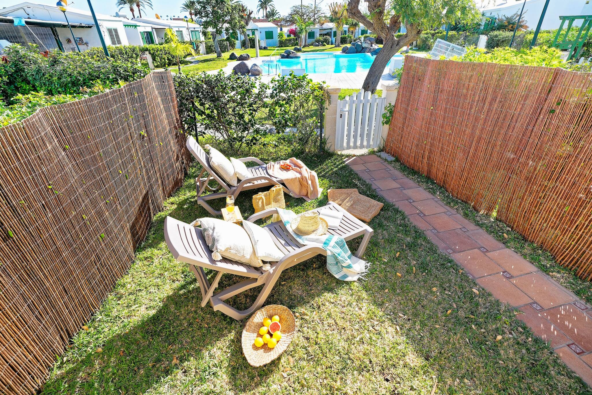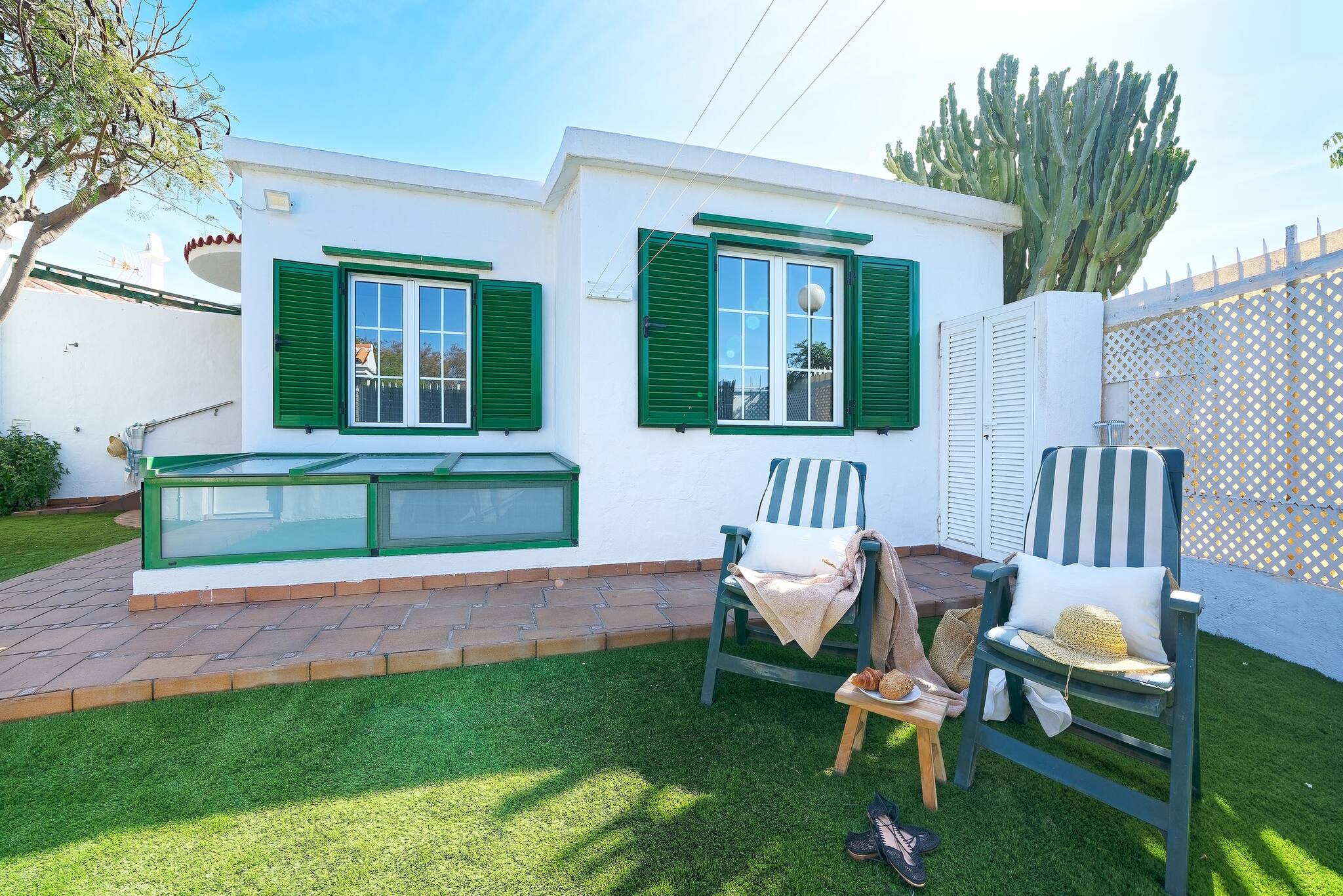The villa in Maspalomas has 4 bedrooms and has capacity for 6 people. The villa is comfortable, is spacious, and is 80 m². The property is located right next to the golf-course. It has views of the garden and the swimming pool. The property is located 200 m from Centro comercial faro 2 supermarket, 300 m from Campo de golf de Maspalomas golf course, 300 m from C.C. Faro 2. the restaurant, 1 km from HolidayWorld amusement park / theme park, 2 km from Playa del Inglés sand beach, 2 km from Dunas de Maspalomas nature reserve, 2 km from Estación de Maspalomas bus station, 2 km from Maspalomas city, 5 km from Aqualand Maspalomas water park, 7 km from Clínica Roca hospital, 33 km from Aeropuerto de Gran Canaria airport. The house is situated in a lively neighborhood close to a shopping area and restaurants.The accommodation is equipped with the following items: garden, garden furniture, washing machine, iron, internet (Wi-Fi), hair dryer, air-conditioned, communal swimming pool, 1 TV, satellite tv (Languages: Spanish, English, German, French).In the hotplate of glass ceramics open plan kitchen, refrigerator, microwave, oven, freezer, dishwasher, dishes/cutlery, kitchen utensils, coffee machine, toaster, kettle and hob are provided.