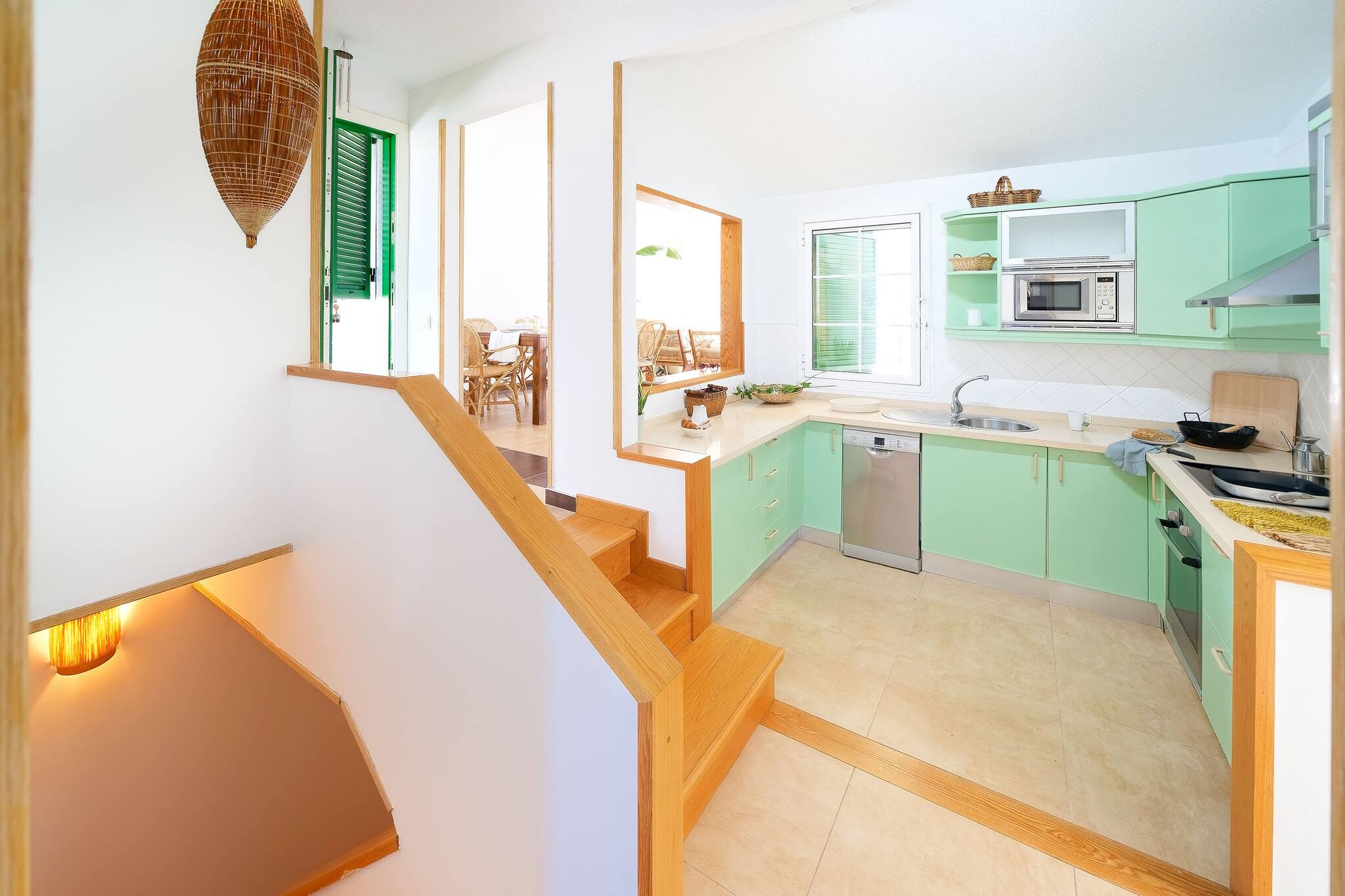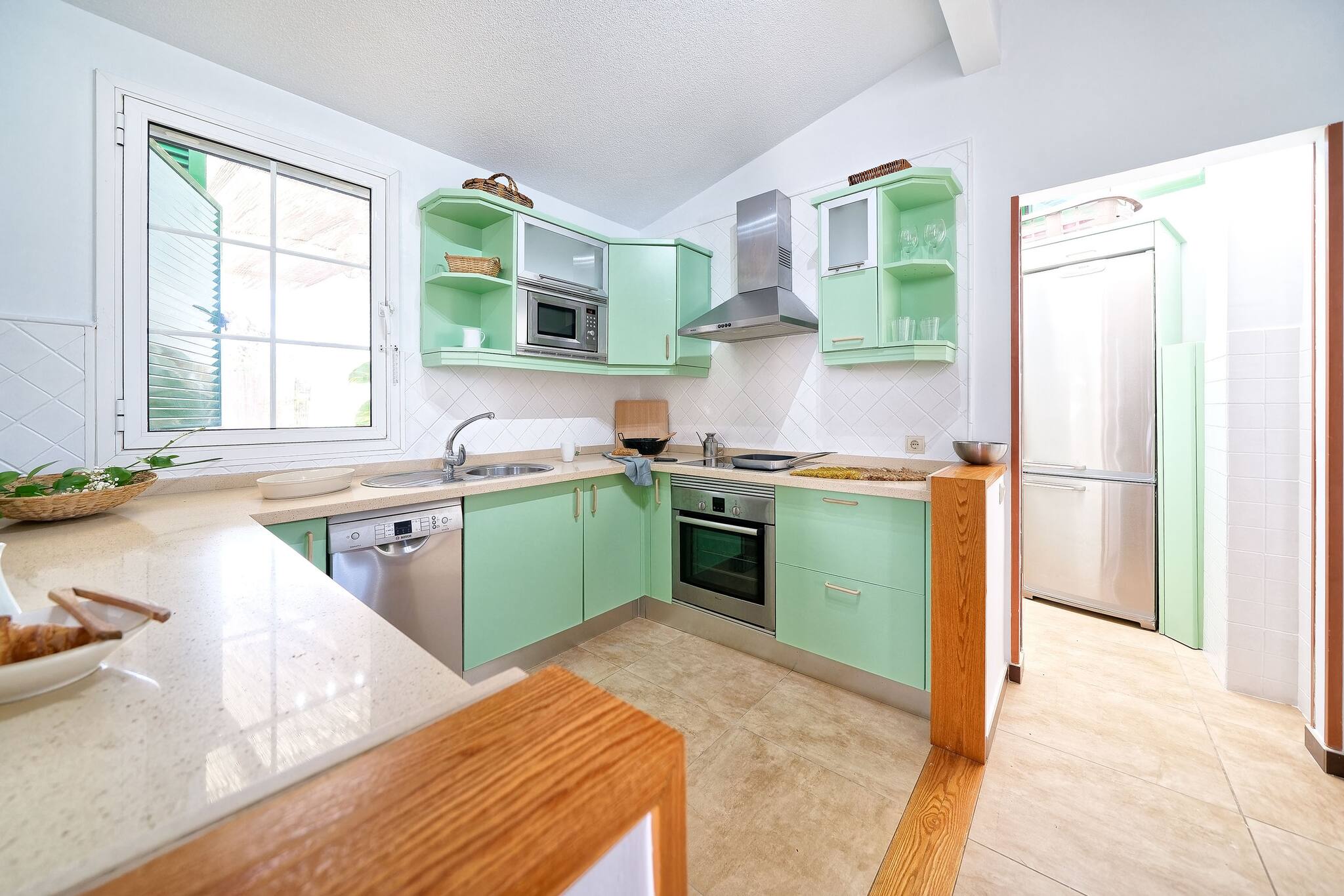 In the hotplate of glass ceramics open plan kitchen, refrigerator, microwave, oven, freezer, dishwasher, dishes/cutlery, kitchen utensils, coffee machine, toaster, kettle and hob are provided.